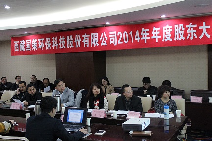 西藏國策環(huán)??萍脊煞萦邢薰?014年度年度股東大會在成都召開,董事會秘書楊偉強(qiáng)主持會議。董事長兼總經(jīng)理陳鴻、副董事長范津濤、副總經(jīng)理幸川、財務(wù)總監(jiān)趙永花、證券部經(jīng)理張麗等公司董事及核心成員出席本次會議。