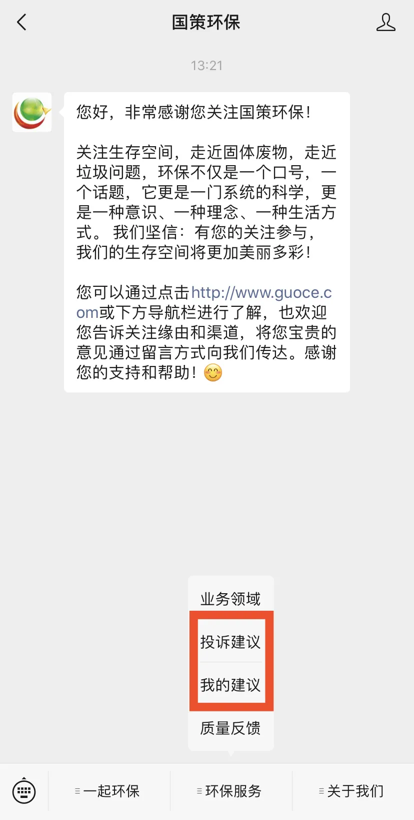 同時,社會公眾可通過關注國策環(huán)保微信公眾號,對國策環(huán)保運營項目的環(huán)衛(wèi)質(zhì)量和服務水平提出意見和建議,對保潔不到位、清運不及時的路段或點位拍照上傳,反饋到云平臺,國策環(huán)保將根據(jù)處理進度,推送處理結(jié)果,達到社會共治的創(chuàng)舉。